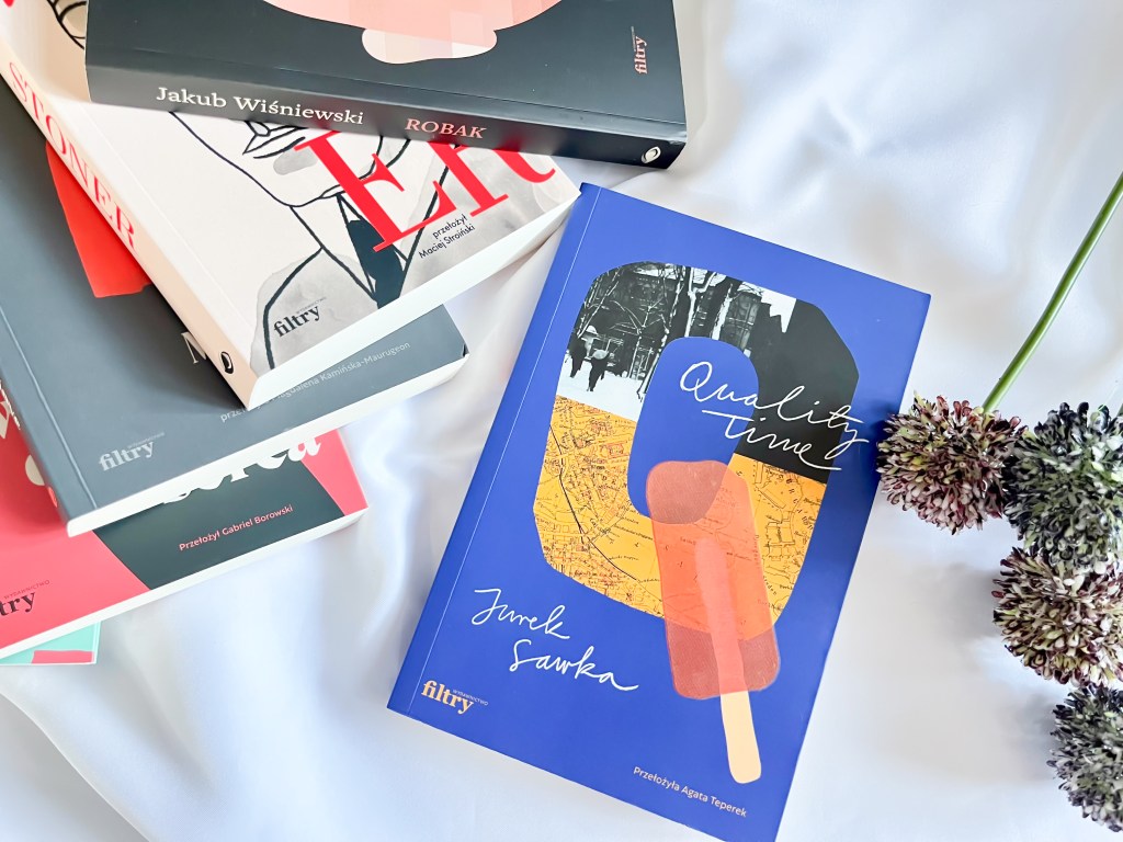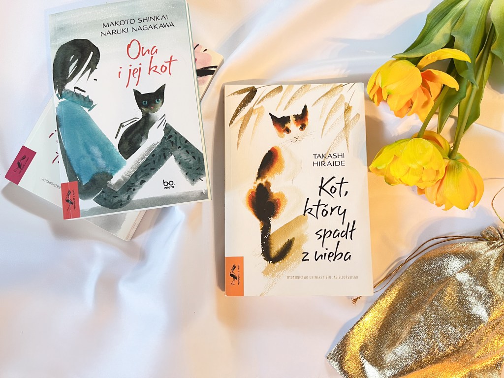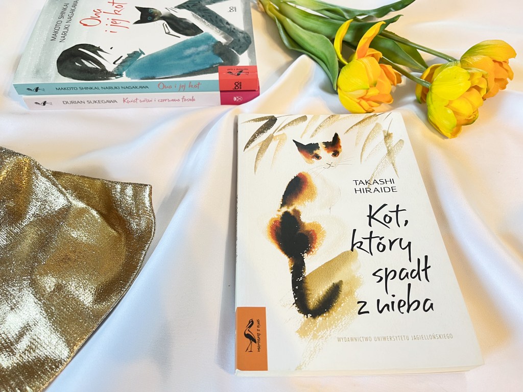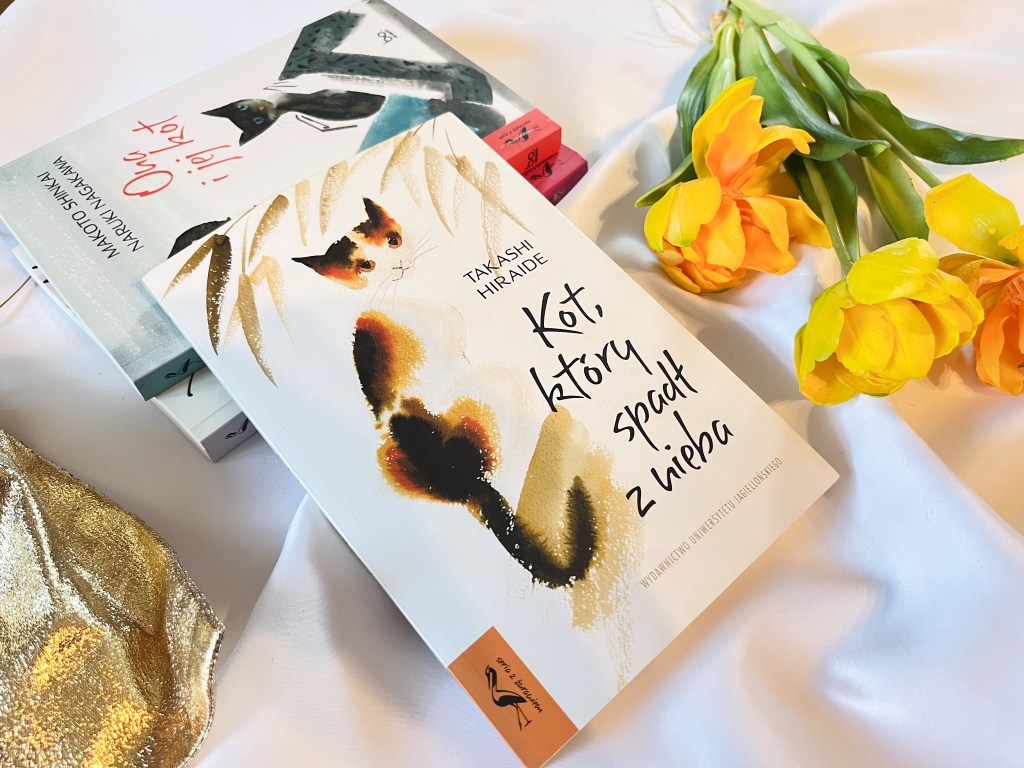 O „Serii z Żurawiem” wydawanej nakładem Wydawnictwo Uniwersytetu Jagiellońskiego nadmieniłam przy okazji poprzednich dwóch recenzji („Kwiat wiśni i czerwona fasola” oraz „Ona i jej kot”). Po pierwsze zachwyciłam się samym faktem, że WUJ wydaje nie tylko książki popularnonaukowe i naukowe, ale także literaturę piękną. Po drugie zafascynowałam się samą „Serią z żurawiem”, która ma w swoich zasobach co nieco wartościowej, azjatyckiej i nie tylko literatury. W jej wydaniach znajdziecie również prozę europejską. Warto byście sami sprawdzili https://wuj.pl/serie-wydawnicze/seria-z-zurawiem. Po trzecie niezwykle spodobały mi się okładki. Podobnie jak okładka książki „Kot, który spadł z nieba” Takashi Hiraide🙂, która jak dwie poprzednie jest autorstwa Małgorzaty Flis. Uwielbiam tę kreskę.