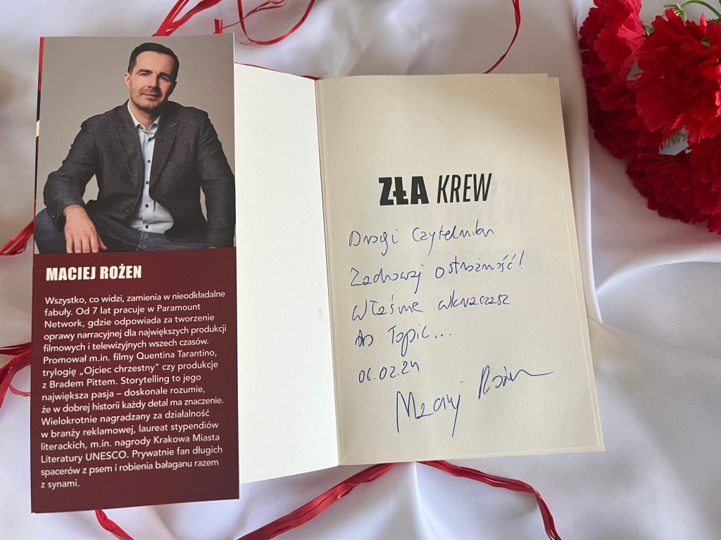 Pamiętacie takie telefony komórkowe z antenką? Jeśli nie pamiętacie, to znaczy, że jesteście za młodzi. Nic straconego wygooglujcie sobie. Warte są spojrzenia. Ja pamiętam. Pamiętam również to uczucie, że nie będąc ową bogatą, na takie telefony z antenką nie było mnie stać i z zazdrością patrzyłam, jak ludzie rozmawiają z różnych miejsc nie uwiązani do kabla telefonicznego. „Zła krew” Macieja Rożena jest pełna takich retro smaczków. Akcja dzieje się bowiem od 11 sierpnia 1997 roku do 9 lutego 1998 roku. W powieści natknąć się możecie również na telefony stacjonarne. Na dzwonienie z budki telefonicznej, o dziwo! Na wątek z kasetami VHS wypożyczanymi z wypożyczalni. Oj tak pamiętam. Czy na muzykę z płyt CD, które ktoś może z nas jeszcze w domach ma, ale praktycznie nie odtwarza. Bo po co. Przecież jest spotify. Są też polonezy, cinquecento, od czasu do czasu jakiś początkowy golf, czy volvo. Nie wiem dlaczego Maciej Rożen umiejscowił tę intrygę kryminalną w minionych czasach, ponad dwadzieścia siedem lat temu. Może tak jak ja pamięta te czasy lub raczej chciałby pamiętać. Muszę go o to zapytać przy okazji jakiegoś spotkania autorskiego.